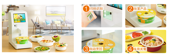 智能烹飪設備,與健康預制飯菜配合使用。當智能烹飪設備對預制菜進行識別后,便會自動開始烹飪。只需3-5分鐘,便可以享受到一道現做美味。