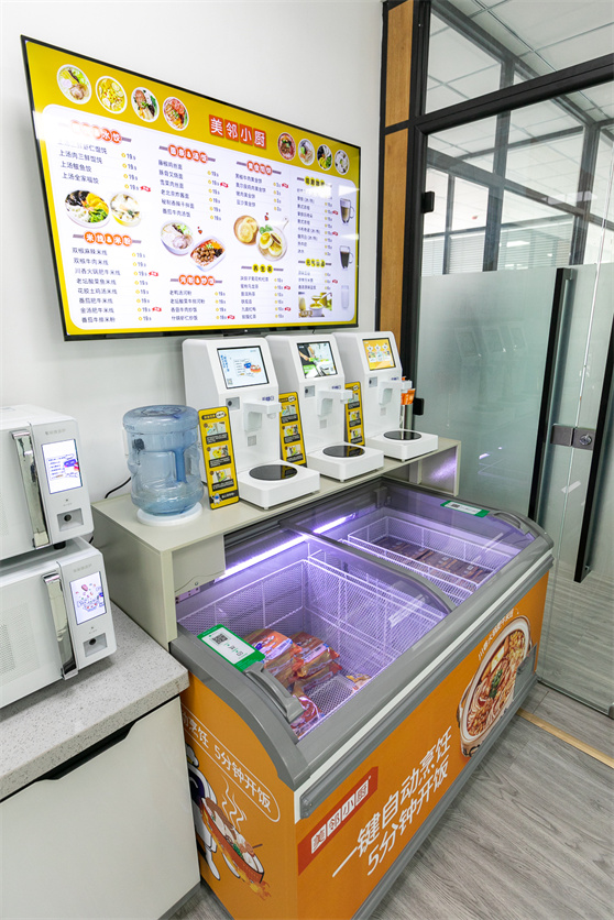 美鄰小廚打造的智能餐飲解決方案,創業門檻低、市場前景廣闊,針對沒有廚師、沒有廚房的場景,在不增加人工、不裝修改造的情況下,提供無明火、無油煙、無損耗的24小時美味供應,為寫字樓、加油站、景區、酒店等非傳統餐飲場所的顧客解決就餐需求。