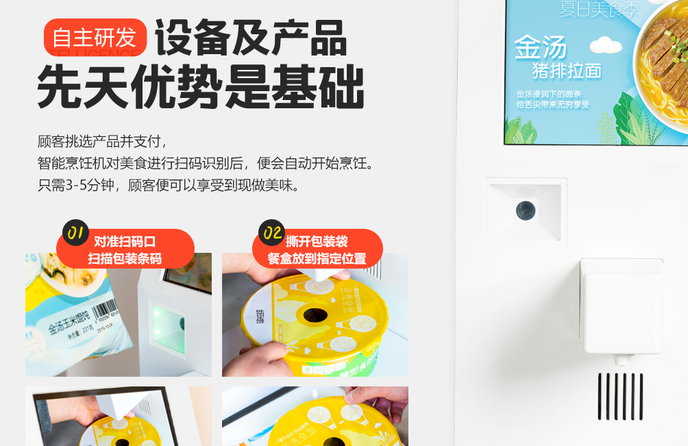 顧客挑選產(chǎn)品并支付, 智能烹飪機對美食進行掃碼識別后,便會自動開始烹飪。 只需3-5分鐘,顧客便可以享受到現(xiàn)做美味。
