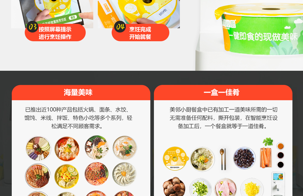 華陰 美鄰小廚餐盒中已有加工一道美味所需的一切無需準備任何配料,撕開包裝,在智能烹飪設(shè)備加工后,一個餐盒就等于一道佳肴。