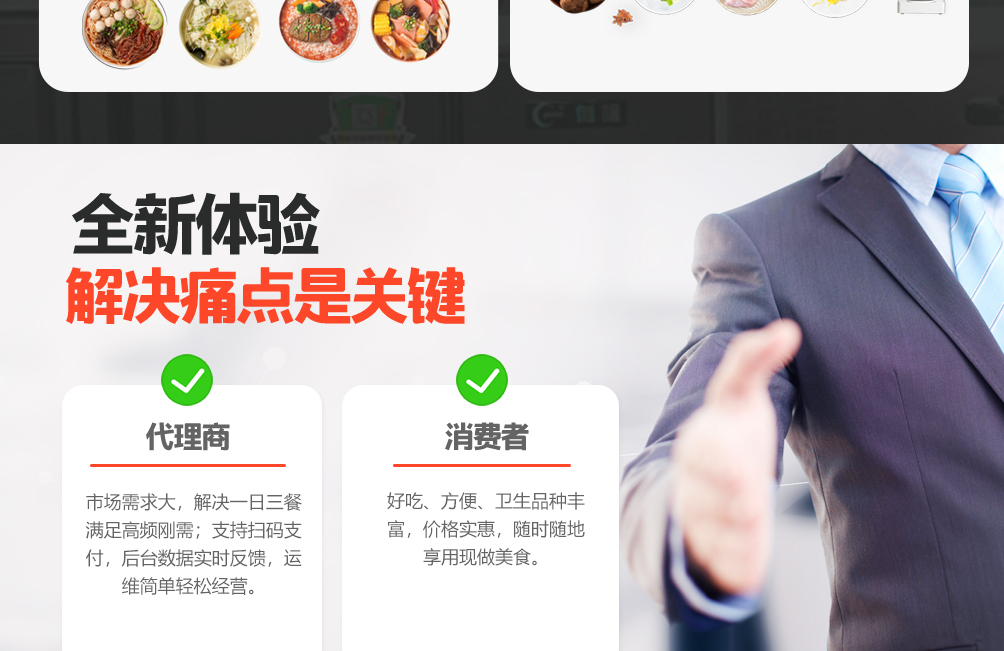 市場需求大,解決一日三餐滿足高頻剛需;支持掃碼支付,后臺數(shù)據(jù)實時反饋,運維簡單輕松經(jīng)營。